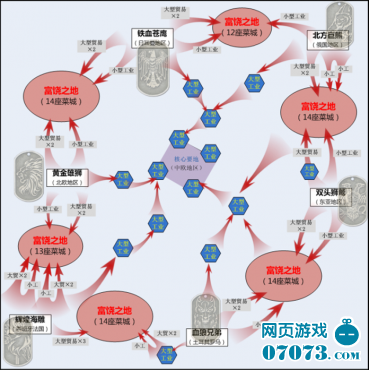在各个势力间,分布着2块富饶之地,主城与富饶之地间存在着2个大型贸易城市及2个小型工业城市,玩家可以选择通过攻打哪个城市进而占领富饶之地。