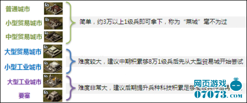 在占领富饶之地后,势力继续前进并占领大型贸易城市及小型工业城市,并在此开设分基地,囤积兵力,以达到进可攻退可守的趋势。富饶之地的每个区域内都有十几个普通城市,普通城市是比较容易占领的,只要玩家势力拥有22500+的兵力即可前往攻打,而在攻打过程中,可以使用以下方法,获得特殊攻防加成:
