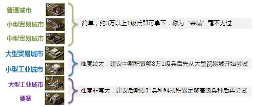 在占领富饶之地后,势力继续前进并占领大型贸易城市及小型工业城市,并在此开设分基地,囤积兵力,以达到进可攻退可守的趋势。富饶之地的每个区域内都有十几个普通城市,普通城市是比较容易占领的,只要玩家势力拥有22500+的兵力即可前往攻打,而在攻打过程中,可以使用以下方法,获得特殊攻防加成: