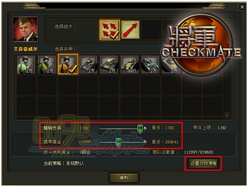 在这里,你可以为军官选择配备当前基地中的任意兵种。为军官选择了兵种后,就需要确认部队的士兵数量,你可以在右侧的输入框中自行输入士兵数量,也可以直接拖动滑块来调节部队的士兵数量。部队可以编组的士兵数量与领军军官的属性息息相关。军官的属性越高,尤其是统帅属性越高,能够率领的士兵数量也越多。确定了军官、兵种和士兵数量后,一定要记得给部队携带足够的黄金,黄金不足将会直接导致部队在战场中失去行动能力。运输兵和运输车可以携带大量的黄金。除了士兵、黄金以外,还可以给每支部队设定攻防策略,合适的攻防策略,可以让部队在战斗中的表现更加优秀。