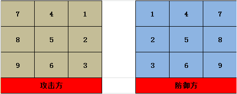 在初期,很早就能获得5个军官的阵型,一般中后期都是5V5的战斗。交战按照九宫格顺序出兵,但是又有所区别。请注意下图: