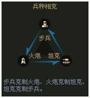 兵种相克也很重要,每次出战前如果安排好兵种相克,则事半功倍。兵种相克原理:火炮克坦克,坦克克步兵,步兵克火炮。一般来讲步兵防御较高,火炮攻击较高,坦克攻守兼备。如图所示: