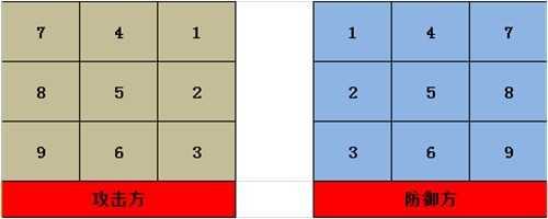 在初期,很早就能获得5个军官的阵型,一般中后期都是5V5的战斗。交战按照九宫格顺序出兵,但是又有所区别。请注意下图: